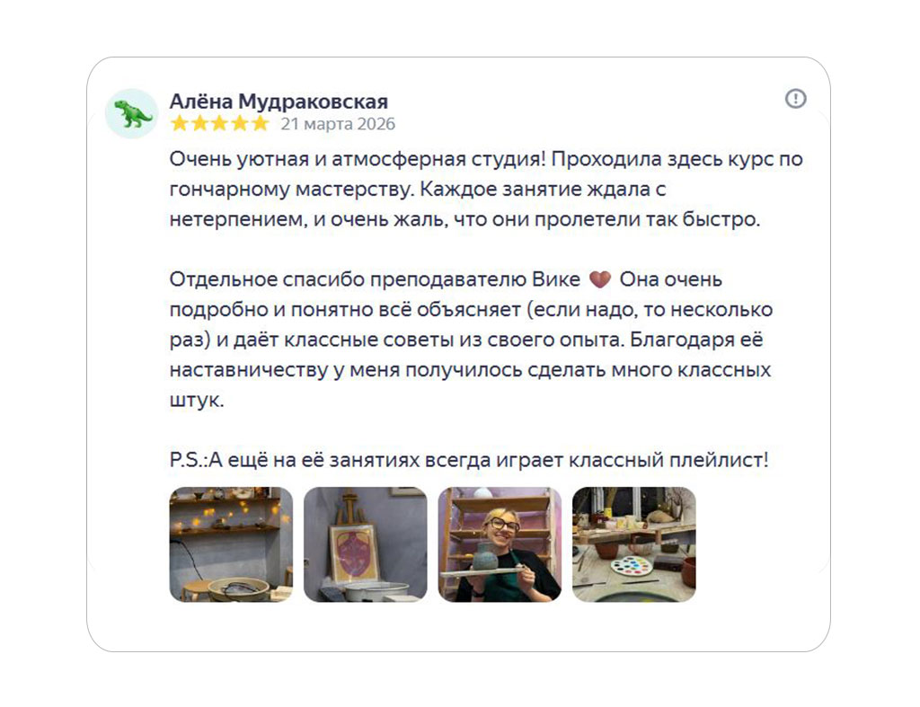 Преподаватель даст основы работы на круге, поставит руки и проведет вместе с вами все этапы обработки изделий.
